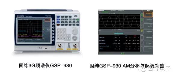 固纬电子研发的GSP-930标配了AM/FM信号分析功能,通过此功能可直接计算出调幅调制深度,调频调变偏移,载波功率,载波频率偏移以及SINDA(signal plus moiseand distortion)等参数。还提供调幅/调频解调收听功能,让用户在调幅或者调频广播下可获得解调后的基频信号,可通过耳机收听。